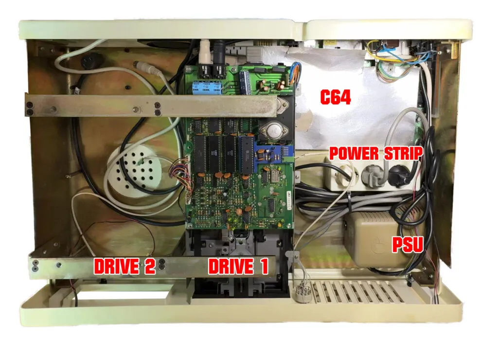 Si stima che siano stati prodotti circa 300 pezzi di questi colossi. All’interno di questo cassone, potevamo avere uno o due drive 1541 / 1570, c’era spazio per l’alimentatore del C64, una ciabatta elettrica per collegare l’alimentatore ed i drive ed in un angolo, con le porte esterne avevamo la scheda di un Commodore 64. Per collegare l’alimentazione e i drive (o il drive) i cavi uscivano dal case per collegarsi nella rispettiva porta disco e di alimentazione della scheda, questo lo rendeva ancora più ingombrante, brutto da vedere e delicato nel trasporto se non si staccavano questi cavi. Beh, dopo tutto questo lavoro forse era meglio pensare a mettere un connettore interno ed evitare questo giro.